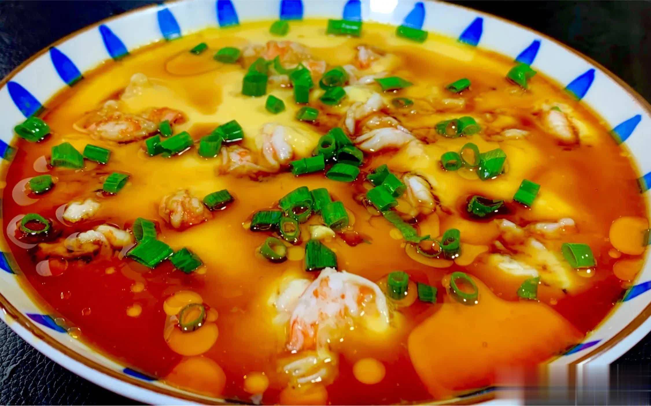 食材:鸡蛋 2 个、虾仁 50 克、温水 150 毫升、盐、香油、生抽适量。