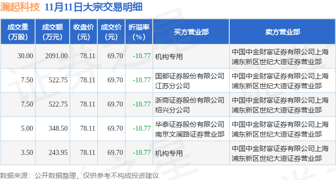 放浪2024年11月11日收盘,澜起科技(688008)报收于78.11元,高潮10.59%,换手率6.96%,成交量79.49万手,成交额59.48亿元。